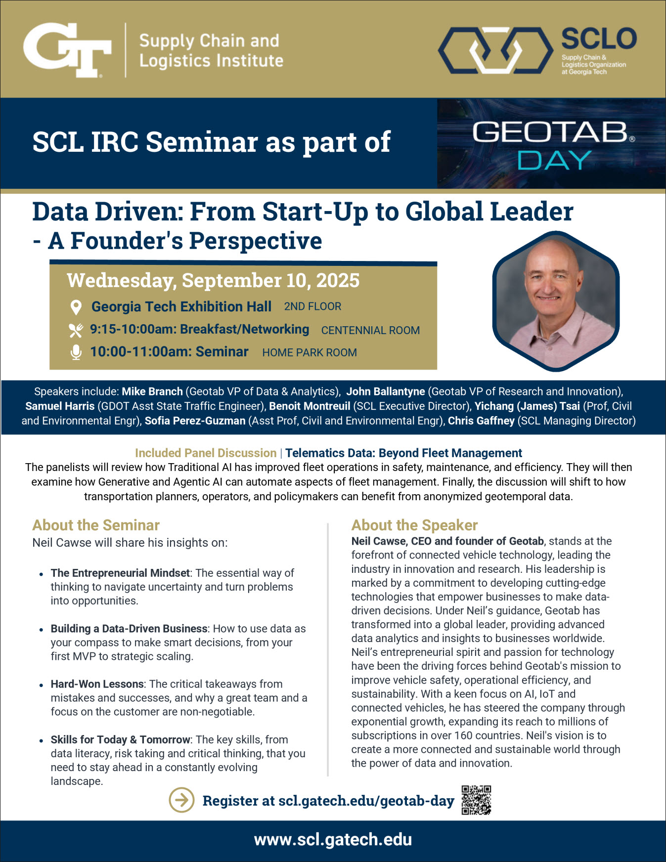 The Supply Chain and Logistics Institute (SCL) and Supply Chain and Logistics Organization (SCLO) Student Group is co-hosting a special event seminar featuring Neil Cawse, CEO and founder of Geotab.